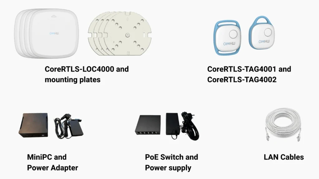 Our Evaluation Kits are complete, pre-validated packages that include tags, locators, and a pre-configured CoreRTLS miniPC. They are designed to give customers a working RTLS system out-of-the-box, enabling rapid evaluation, prototyping, and internal demos without needing to assemble or configure components from scratch.